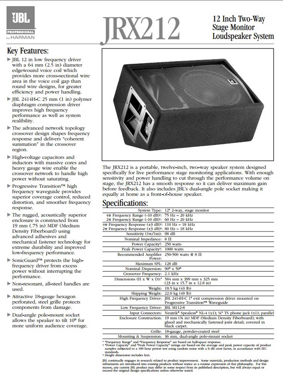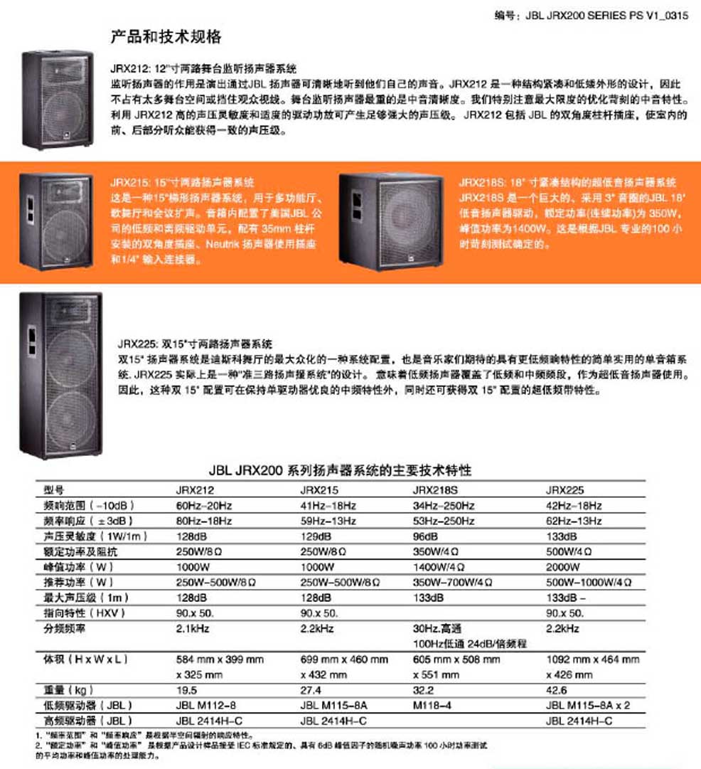 JBL JRX215 舞臺會議室多功能廳音箱 專業音響設備 15寸無源音響 專業揚聲器 會議培訓演出音響系統工程 擴聲系統。JRX215:15" 兩路揚聲器系統 JRX215 和JRX212 固定安裝揚聲器JRX215 和JRX212 是便攜式JRX200 揚聲器系列中的兩個型號產品。兩者都是為懸吊安裝設計的,不適合作疊積和柱桿安裝,因為手柄、腳和柱桿安裝插座都已拆除。3 個內部的金屬螺栓,吊繩穿到附加的M10眼圈螺栓中。在完整的包裝中,提供3 個鍛造眼圈螺栓。其他全部特性與相對應的便攜式揚聲器相同。