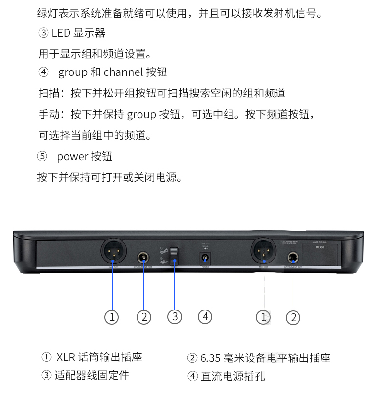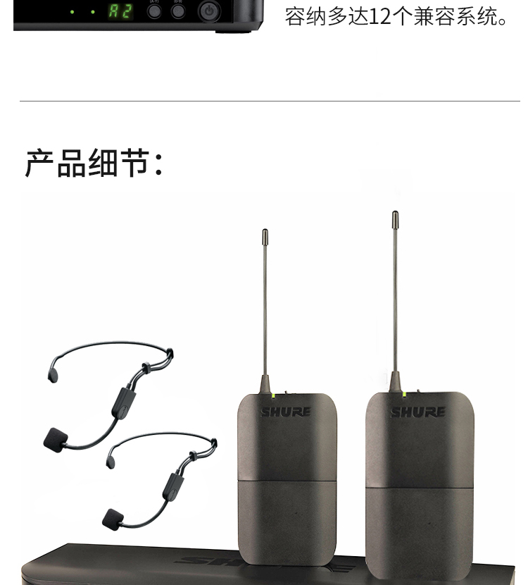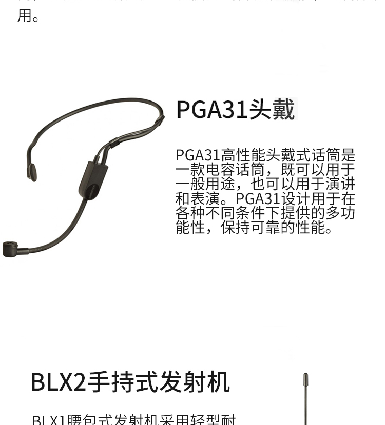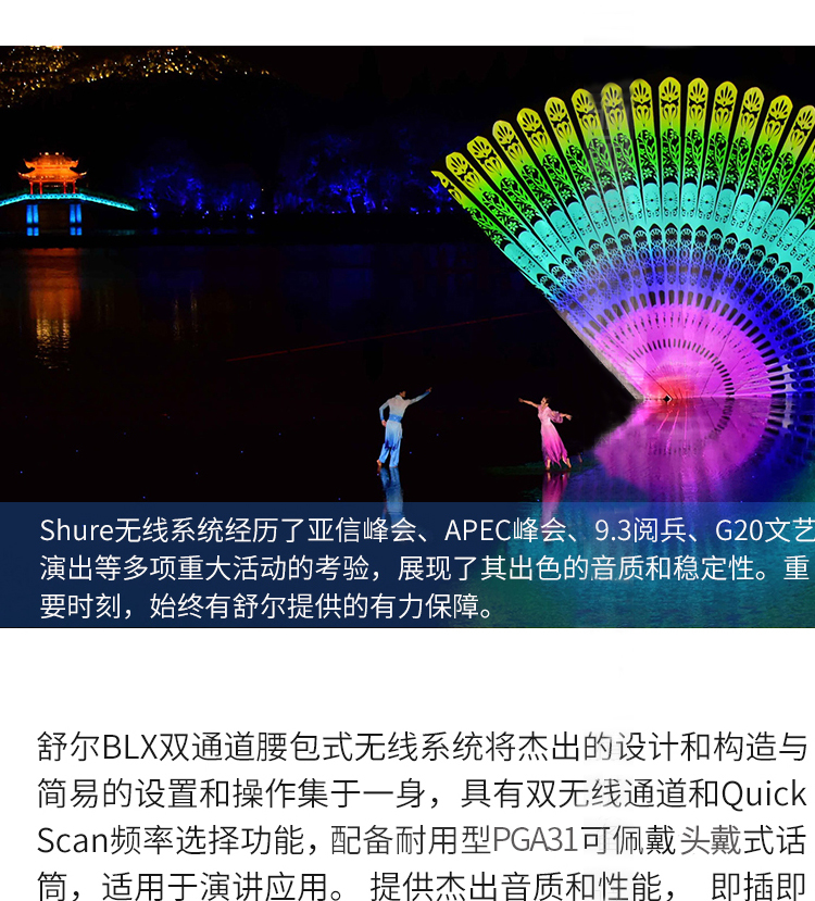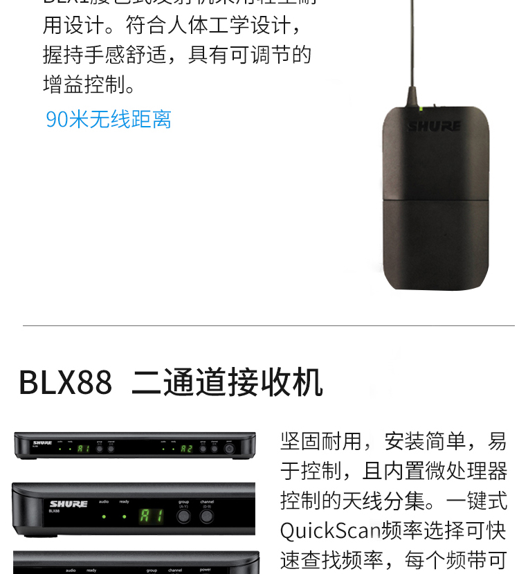舒爾BLX無線系統(tǒng)不僅能夠提供專業(yè)品質(zhì)的音效,并且安裝簡(jiǎn)易,界面直觀,即插即用,品質(zhì)優(yōu)異。其設(shè)計(jì)精密,有手持式、領(lǐng)夾式、樂器和頭戴式等多種配置可選,是舞臺(tái)上的絕佳之選。BLX標(biāo)準(zhǔn)版配備帶PG話筒頭的單通道和雙通道系統(tǒng)。